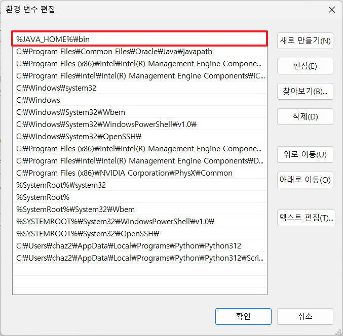 4. java 실행 파일이 위치해 있는 %JAVA_HOME%₩bin 경로를 상단에 추가해준다.