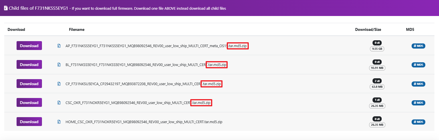 다운로드 후 해당 파일들의 이름을 .tar 확장자로 변경해준다. ( AP_xxxxx.tar.md5 -> AP_xxxxx.tar )