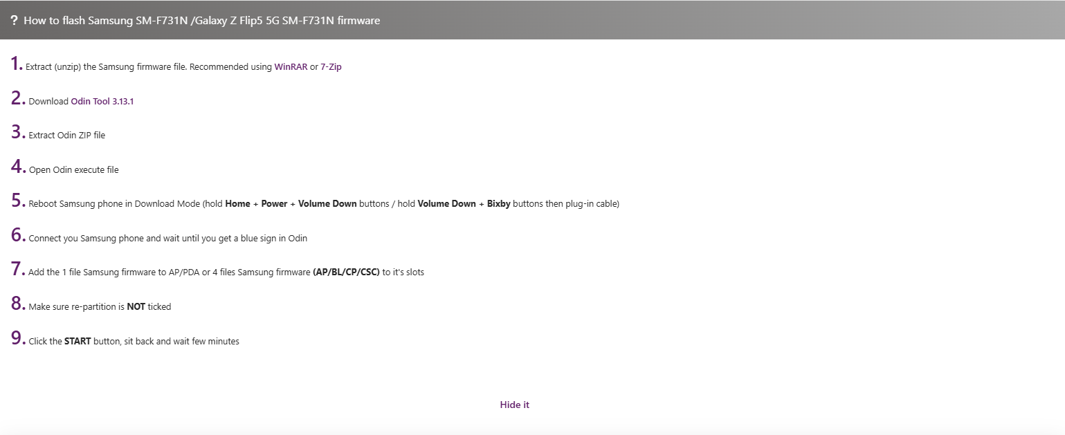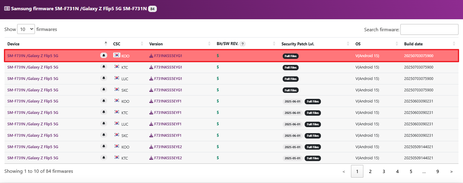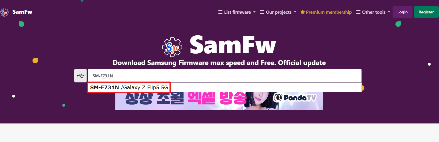 먼저, SamFw 에서 펌웨어 다운로드 해준다. 모델명은 [설정] > [휴대전화 정보] 에서 확인 가능하다.