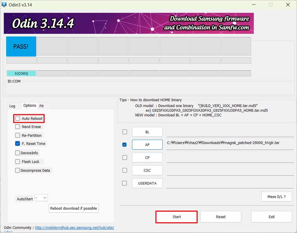 4. Odin에서 AP 항목에 magisk_patched-29000_xxx.tar 추가 후 Auto Reboot 체크 해제 → Start