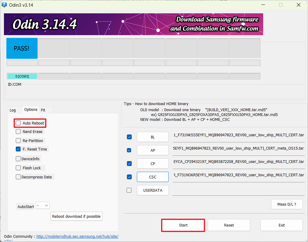3. Odin에서 BL, AP, CP, CSC 항목에 펌웨어 파일 추가 후 Auto Reboot 체크 해제 → Start